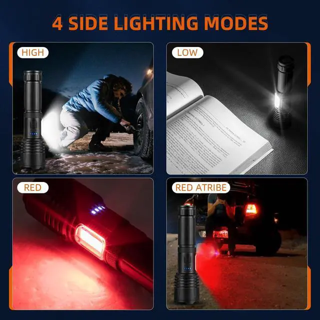 Adjustable Beam: You can adjust the head of the LED rechargeable flashlight to choose between wide-area illumination or long-range illumination. The narrow beam illuminates objects up to 3280 feet away and the wide beam illuminates a room up to 200 square meters.