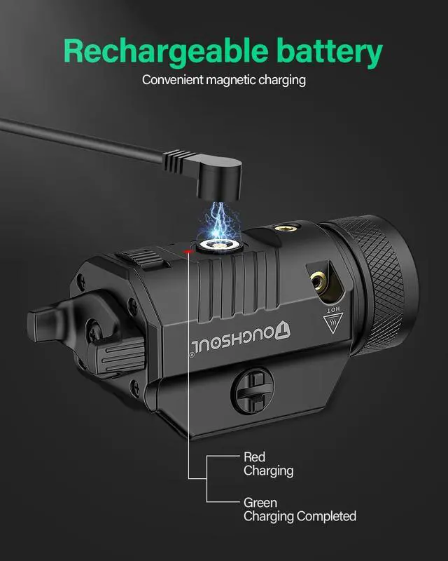 Built in Rechargeable Battery: TF-5020 pistol flashlight laser combo is powered by built-in rechargeable battery. The Magnetic USB port is much more durable and waterproof than the traditional micro USB port.