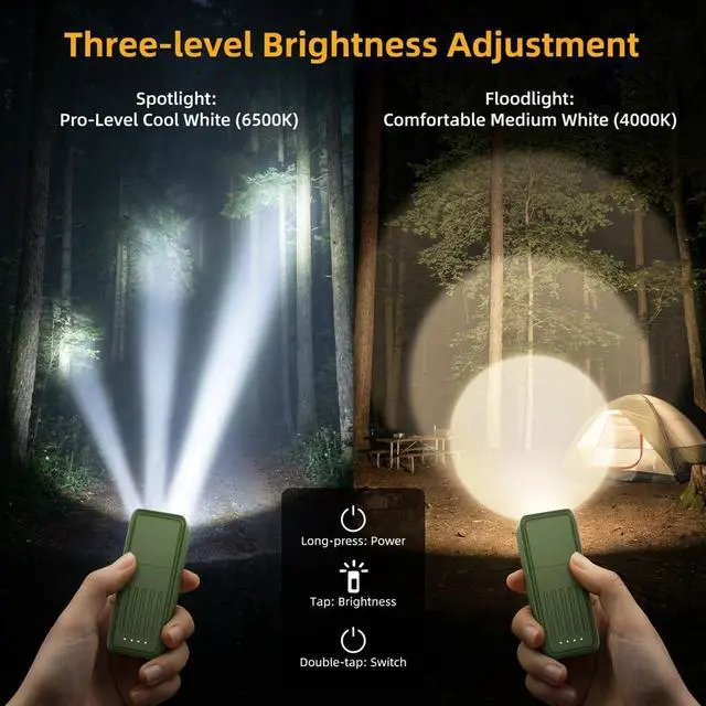This flashlight has ‘4 modes’ and ‘10 lighting effects’. Spotlight and floodlight offer 3 brightness levels each (1W, 0.4W, 0.1W), while SOS and warning flash each have 2 adjustable levels (0.3W, 0.05W) for versatile everyday and emergency use.
