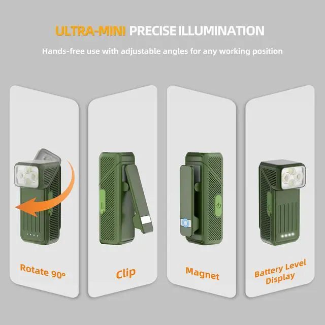 This EDC mini flashlight features a 90° adjustable head, clip/magnet mount, 4 lighting modes, and Type-C charging. Its lighter-sized design is suitable for professional tasks, outdoor emergencies, and everyday carry.