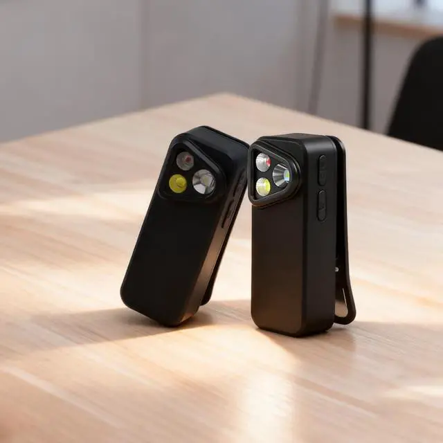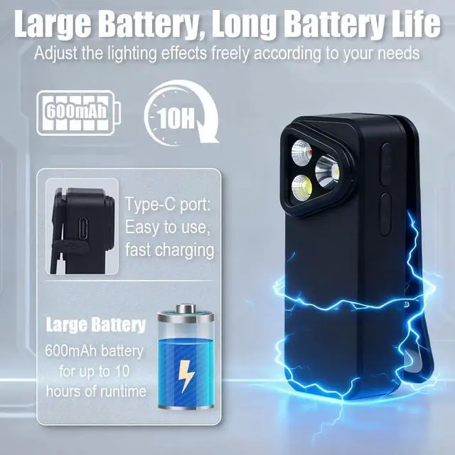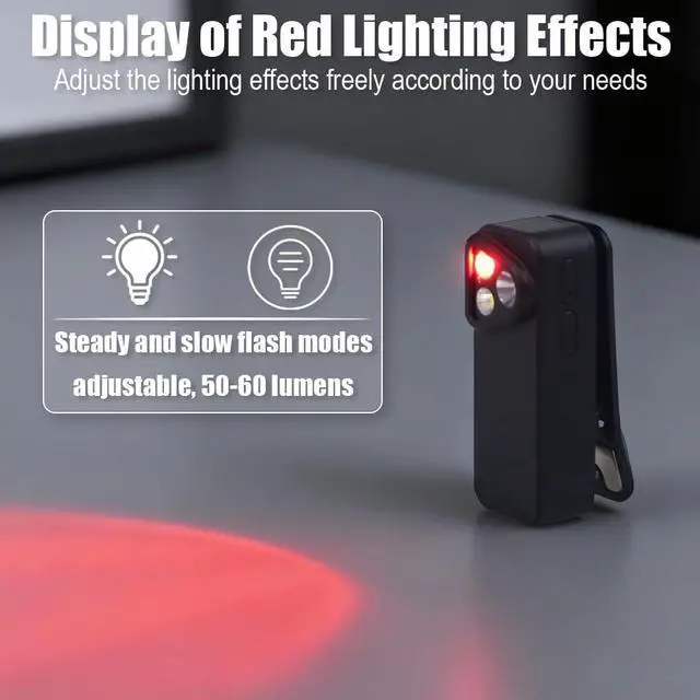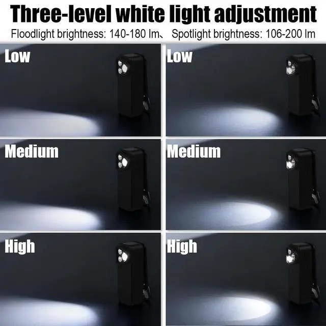 Dual-Light Mini Flashlight: It uses a dual-LED system and features three lighting modes. The main light is white, with flood and spotlight modes, and three adjustable brightness levels (low, medium, and high). The brightness can be easily switched via a button switch. The auxiliary light is red, and the button switch cycles through colors; a single click toggles the red flashing mode.