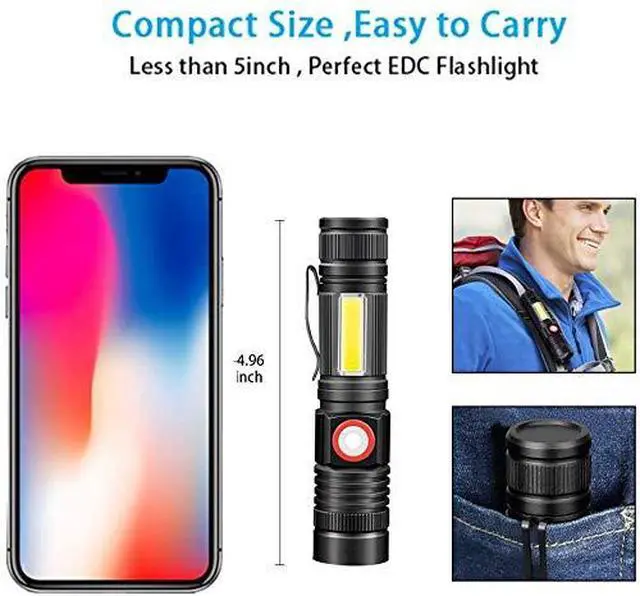 Rechargeable flashlight pocket size, Only 4.96"in length and 5onces in weight . easily put in pocket, perfect Flashlight for camping, walking dogs, daily and emergency use