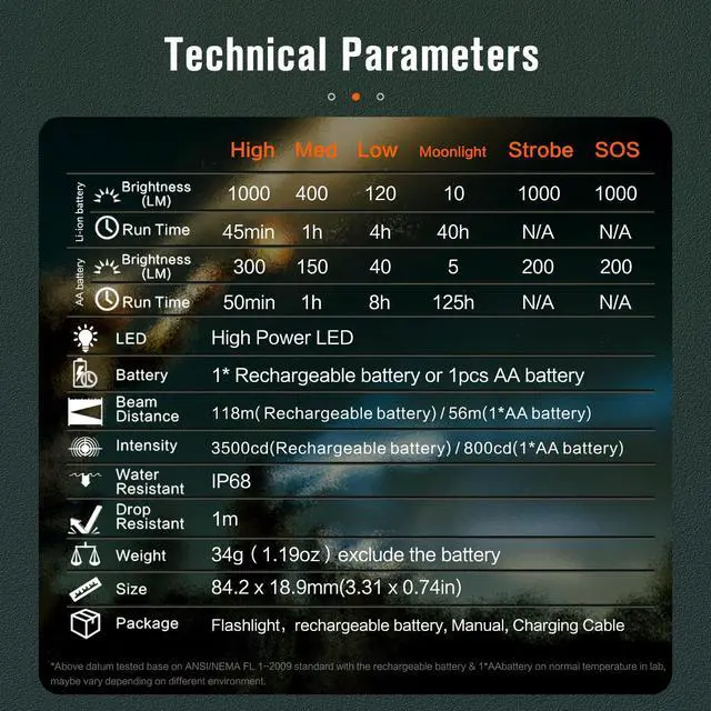 Powerful: N1pro super bright flashlight delivering powerful 1000 lumens beam that extends up to 118 meters. Featuring four lighting modes (high, medium, low, moom strobe and SOS), the powerful flashlights high lumens cater to illumination needs across various scenarios, from hiking and dog walks to everyday use and emergency