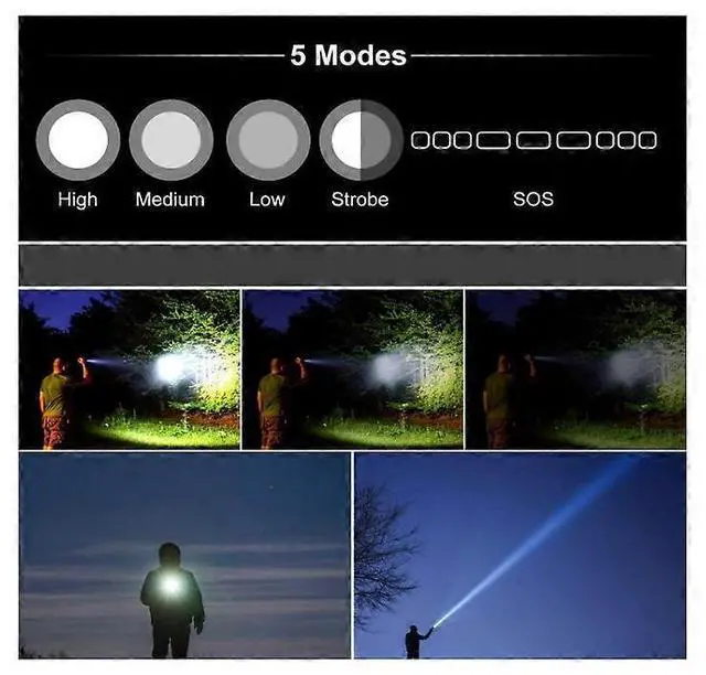 - 5 versatile lighting modes: High, Medium, Low, Strobe, and SOS for varied needs