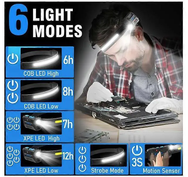 6 versatile light modes (COB High/Low, XPE High/Low, Strobe, Motion Sensor) for hands-free operation