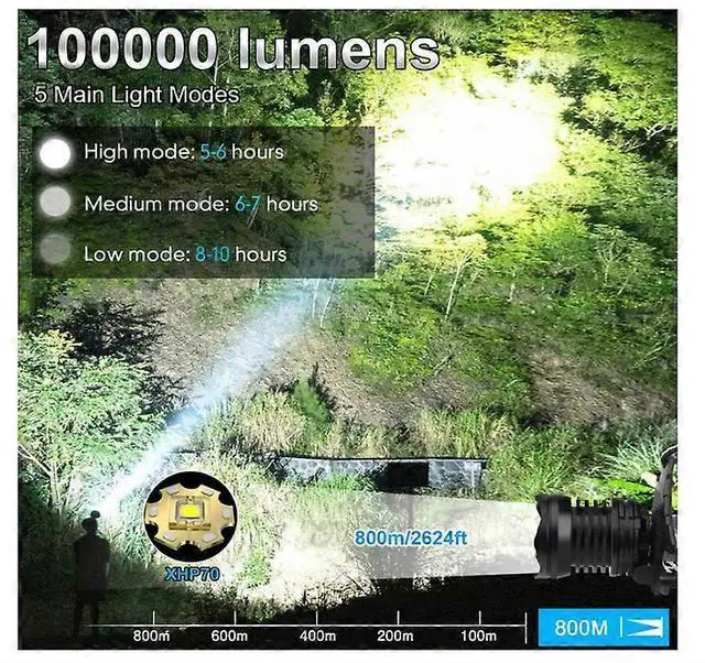 000 Lumens**: Illuminates up to 800m/2624ft for maximum visibility in complete darkness