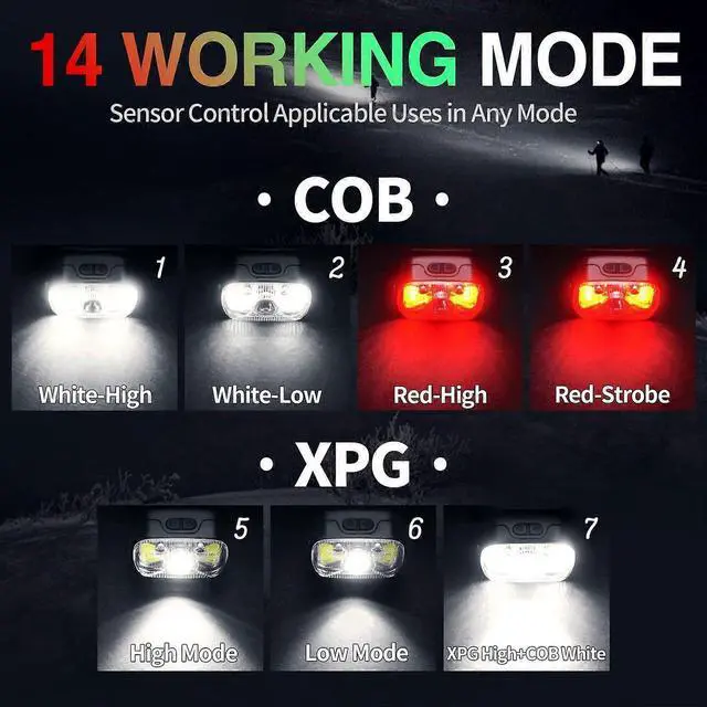 14 Versatile Lighting Modes: Choose from 5 white light levels (high/medium/low), 2 COB white light settings, red light, and strobe modes for emergencies and varied tasks.