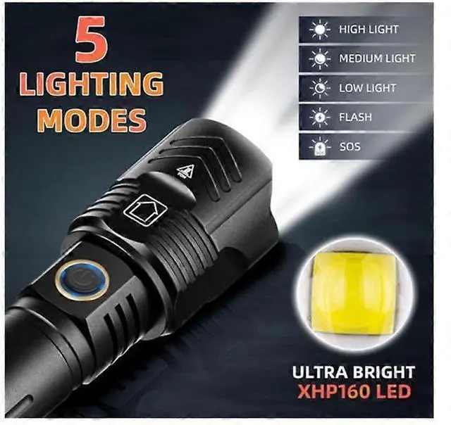 Experience ultimate brightness and durability with our rechargeable tactical flashlight. Built with upgraded XHP 160.2 LED chips, it delivers an impressive 1000000 lumens and a beam distance of up to 1000m. Enjoy versatile lighting with 5 modes (Strong, Medium, Low, Strobe, SOS) and telescopic zoom for adjustable spotlight and floodlight. Features include a convenient Type-C charging port, overcharge/over-discharge protection, and IPX5 waterproof rating for use in rain, snow, or emergencies. Crafted from high-quality aviation aluminum for excellent heat dissipation and shock resistance, this pocket handheld flashlight is perfect for outdoor adventures, tactical use, and emergency preparedness.