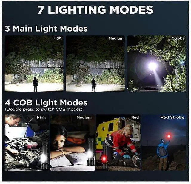 * **Convenient Handheld Light**: Ideal for hiking, dog walking, power outages, car repairs, and home security, offering both wide and long-distance lighting.