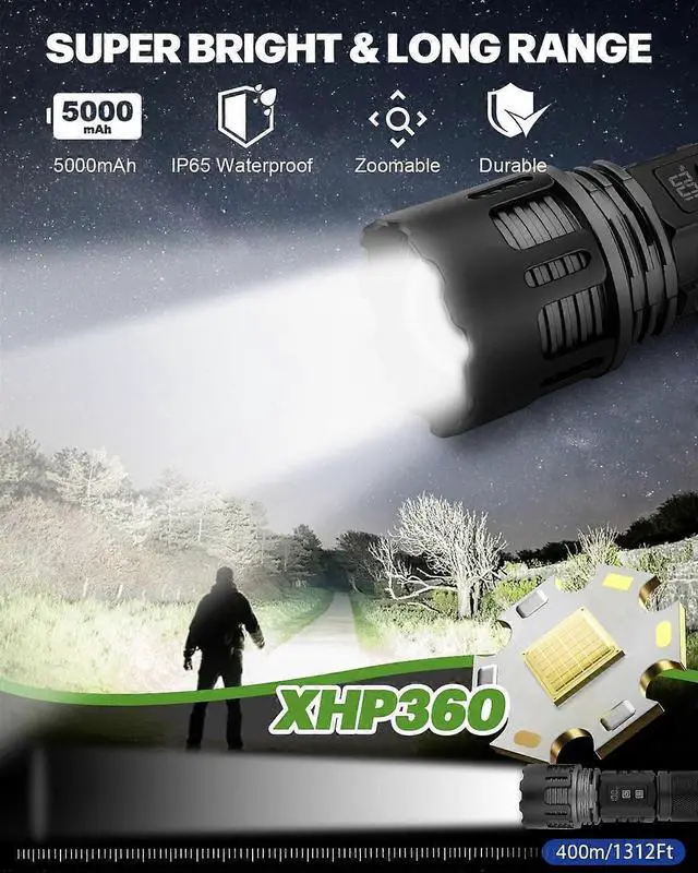 **Rechargeable & Zoomable**: Built-in 5000mAh battery provides 5-10 hours of runtime; adjustable focus switches between flood and spot beams.
