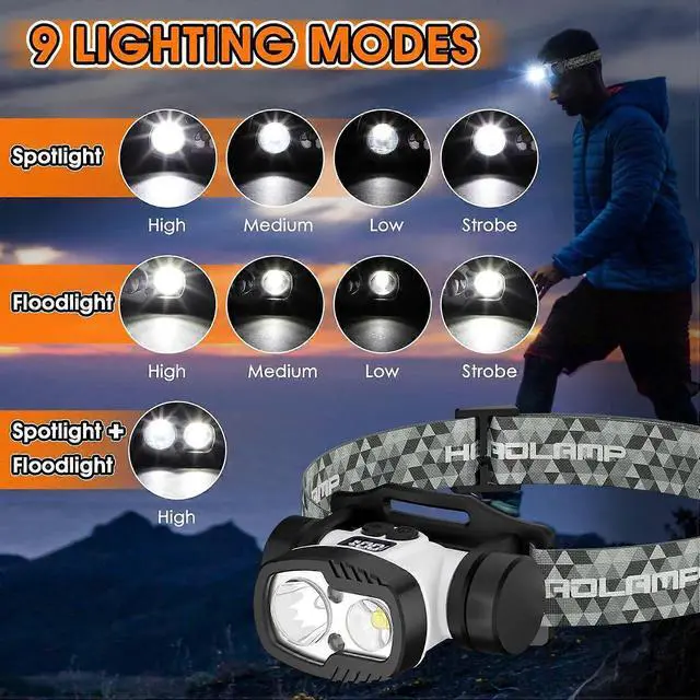 **9 Versatile Lighting Modes**: Choose from spotlight (high/medium/low/strobe), floodlight (high/medium/low/strobe), and dual light mode for maximum brightness and flexibility