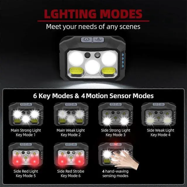 **6 Lighting Modes** Includes main/weak white light, side white/red light, and red strobe for versatile illumination