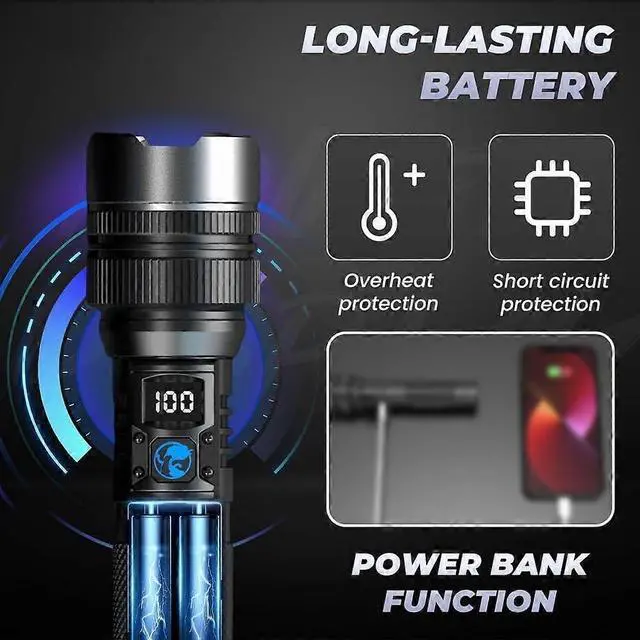 **USB Rechargeable & Power Bank Function**: Fast-charge via USB and use the flashlight as a portable charger for your phone, ideal for on-the-go convenience.