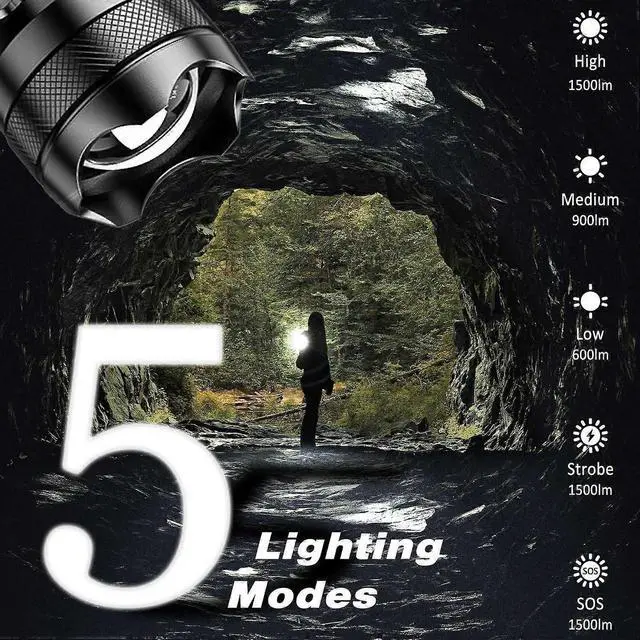 **5 Lighting Modes & Zoom Function**: Switch between High (1500LM), Medium, Low, Strobe, and SOS modes; adjustable focus from flood to spotlight for versatile use.