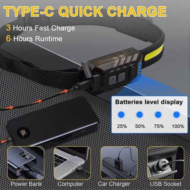 6 versatile lighting modes: COB+XTE dual light, wide-angle, red light for emergencies, and sensor mode