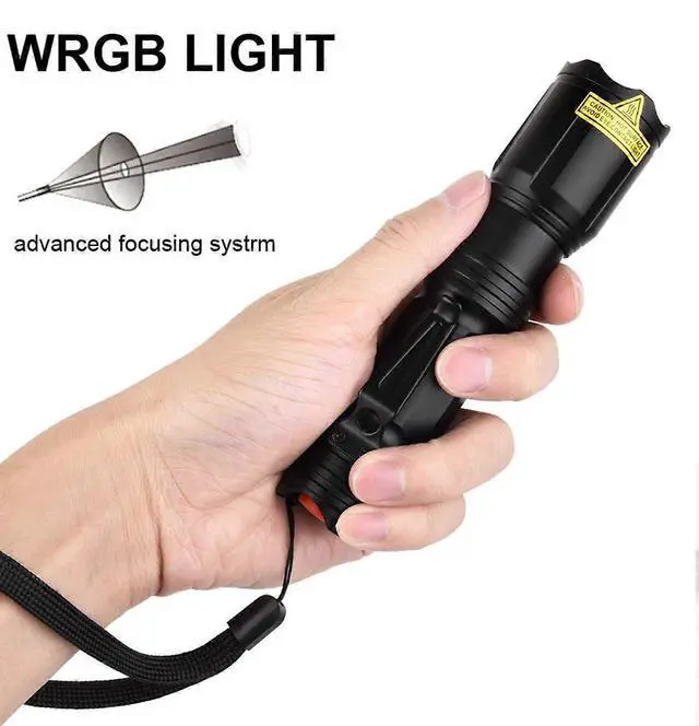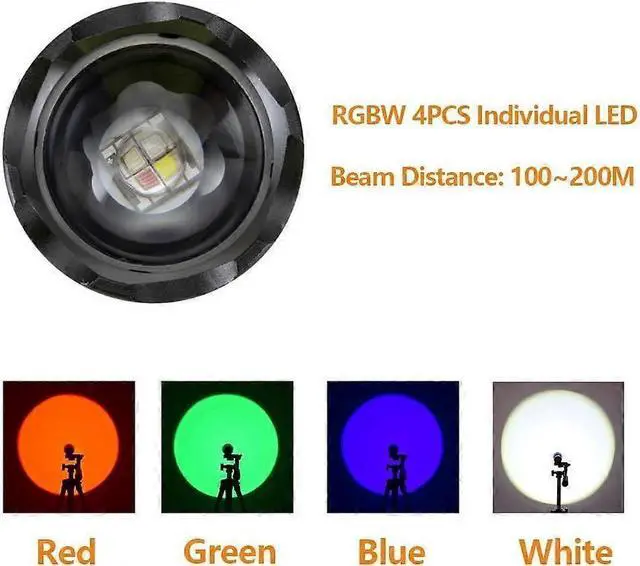 This versatile 4-in-1 LED tactical flashlight combines red, green, blue, and white light sources in one durable, high-performance tool. Ideal for outdoor adventures, emergency situations, and professional use, it offers exceptional brightness with a beam distance of 100-200 meters.