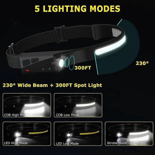 5 light modes: COB high/low, LED high/low, and strobe for various scenarios