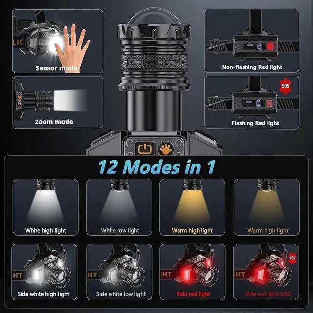 12 Versatile Lighting Modes: Includes high/low white, warm, red SOS, warning lights, and zoom functions