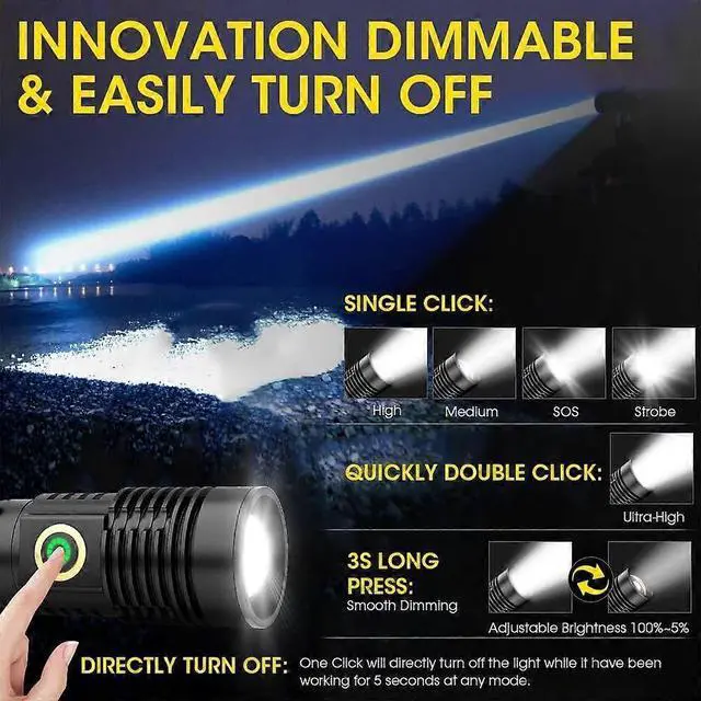 * **6 Versatile Lighting Modes**: Choose from High, Medium, Strobe, SOS, Ultra-High, and Smooth Dimming to adjust brightness from 100% to 5% for any task.