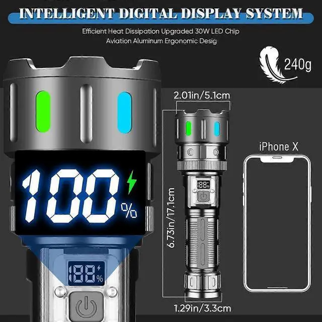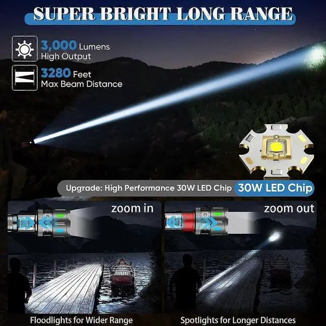 Super Bright LED: Delivers 10x the brightness of standard flashlights, illuminating up to 3280 feet for vast areas or distant objects.