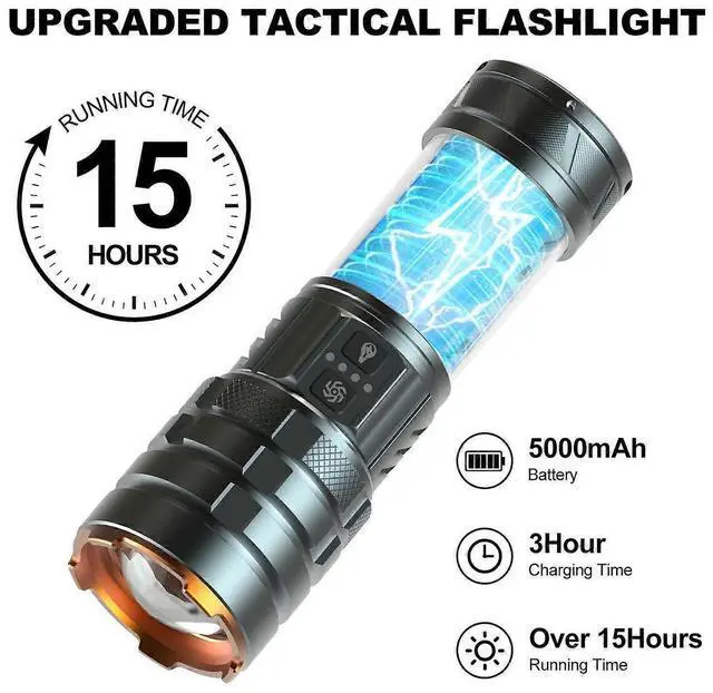 **2-in-1 Flashlight & Lantern**: Switch between 5 main light modes (5000LM/2000LM/800LM/FLASH/SOS) and 3 warm lantern modes (2000LM/500LM/breathing) for versatile outdoor use.