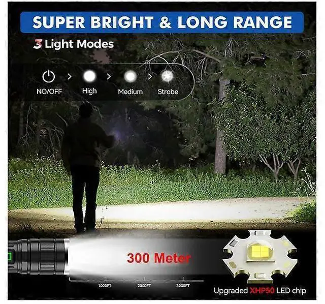 - **6000 Lumens High Output**: Advanced LED chip provides 10x the brightness of standard flashlights, lighting areas up to 150 sqm or spotting objects 300m away.