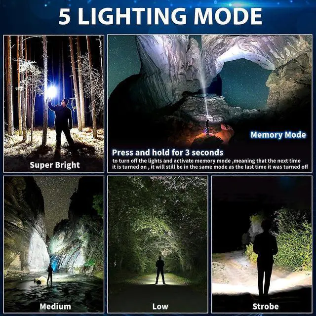 **5 Versatile Modes with Memory**: High, medium, low, strobe, and SOS modes; memory function recalls your last setting automatically.