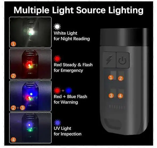 **Multiple Lighting Modes**: 4 brightness levels and 5 side modes (white, red, flashing, UV) for various scenarios