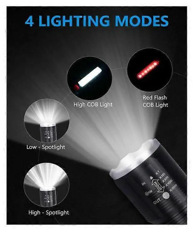 4 modes: High/Low Spotlight, High COB Light, and Red Flash