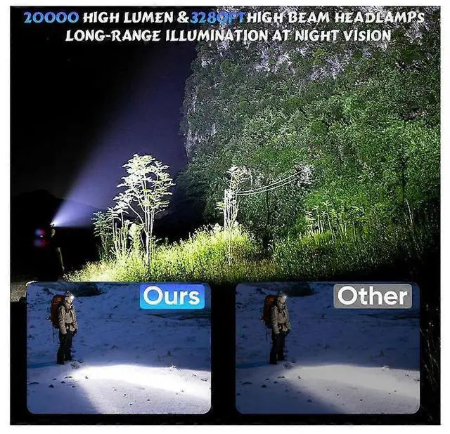 Experience ultimate hands-free lighting with this super bright 20000 lumens LED head torch, featuring a 30W upgraded chip for up to 1000m illumination range. Ideal for outdoor adventures and nighttime tasks, it offers versatile functionality and comfort.