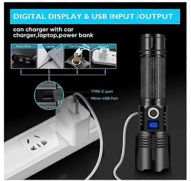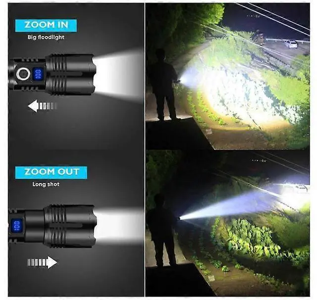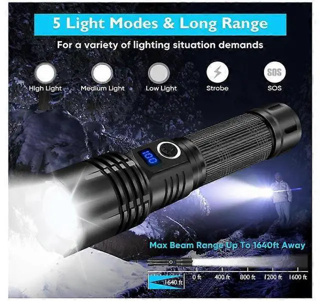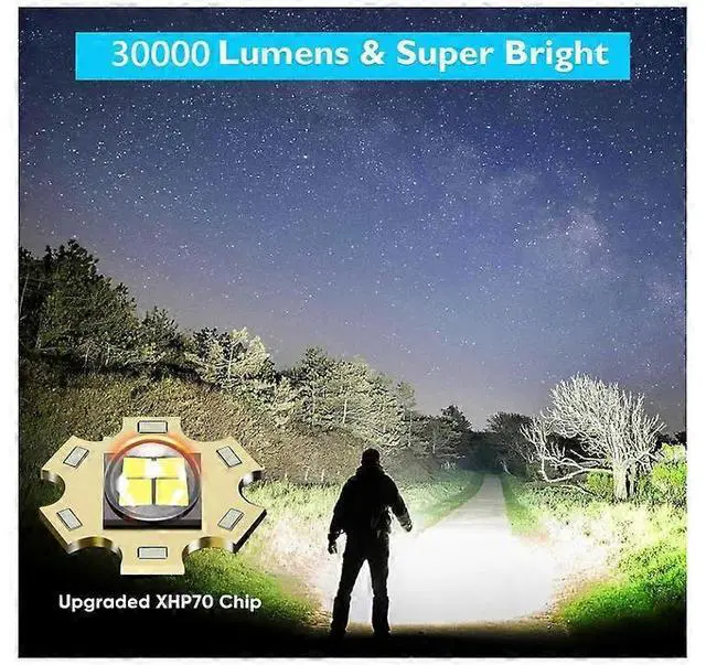 Experience ultimate brightness and reliability with our upgraded XHP70 LED tactical flashlight. This powerful torch delivers 30, 000 lumens10x brighter than standard flashlightsilluminating areas up to 1, 000 sq ft or focusing on objects 1, 640 feet away. Perfect for camping, emergencies, and outdoor adventures.