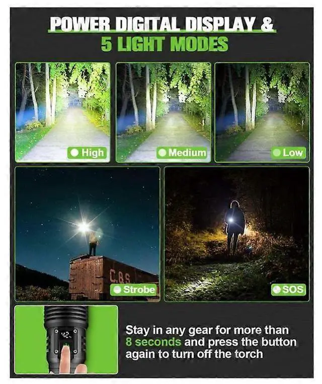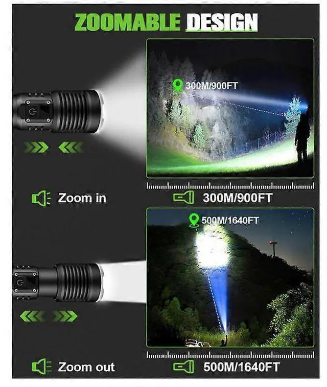 **5 Light Modes & Adjustable Focus**: Switch between High, Medium, Low, Strobe, and SOS modes; zoom function adjusts from spotlight to floodlight for versatile use.