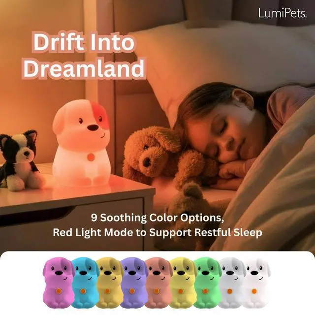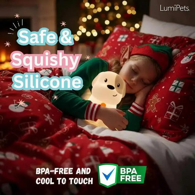 Q: What makes the JAYSUING puppy night light special? A: Unlike hard plastic mood lamp, this squishy baby night light is made from soft, BPA-free silicone lamp that stays cool and is safe for babies and toddlers to cuddle, squeeze, or even chew on. Parents love that it feels like funny stuff and perfect desk gadgets that function as a soothing nightlight. Q: How easy is it to keep clean? A: Very easy! The silicone body of this small bedside lamp wipes clean with a damp cloth, perfect for nurseries. This is a durable and washable Christmas night light for girls and boys that can be kept hygienic for everyday use. Q: What lighting options does it offer? A: The JAYSUING puppy provides 9 color-changing modes including calming white and red light for better sleep, plus 12 levels of brightness so you can set the right glow for any situation, bedtime, late-night diaper changes, or playtime fun. Q: How do kids and parents control it? A: Children can tap the squishy puppy lumi light to change colors, while the included remote lets parents adjust brightness, switch light modes, and set the sleep timer. Q: How long does the battery last? A: The built-in USB-C rechargeable lights battery runs up to 72 hours on a single charge, making this a perfect portable nightlight for sleepovers, travel, car rides, or camping. It recharges quickly with the included cable. Q: Can this help with sleep routines? A: Yes! With its auto shut-off timer (15, 30, or 60 minutes), this soft dimmable lamp helps kids sleep peacefully, comforted by a gentle night light glow. Q: Is this a good giftable idea for kids and suitable for 3 year old girl gifts? A: Absolutely. The puppy dog squishy night light is loved by both boys and girls, making it an adorable puppy baby lamp that also goes perfectly as a 2, 3, or 4 year girl birthday gift. Its one of the coolest Christmas gifts for kids too. With its cuteness, practicality, and safety, its a gift parents will appreciate and children love.