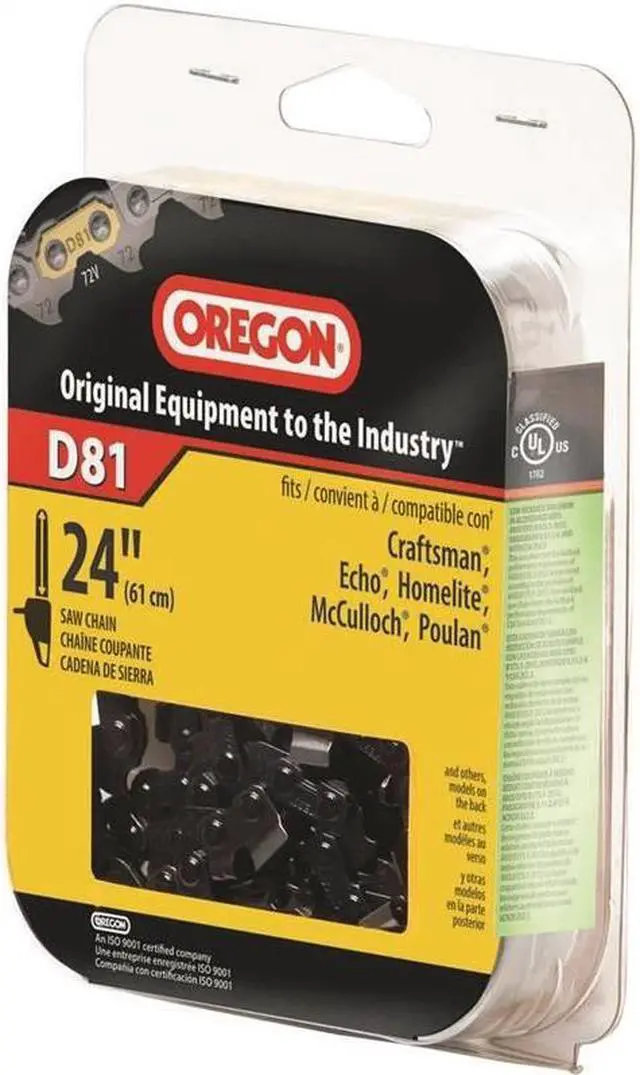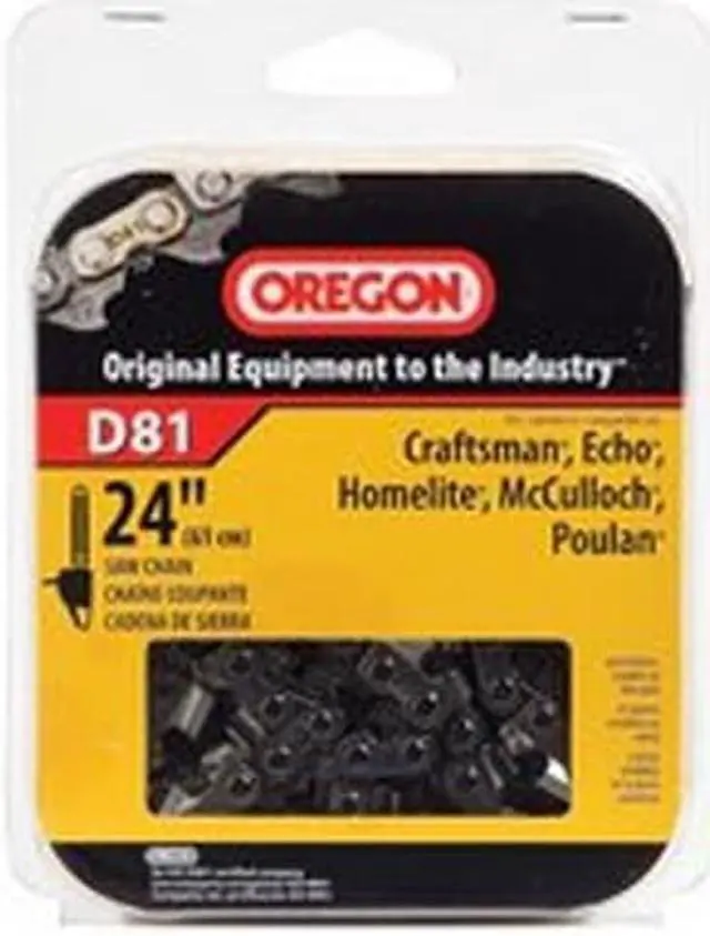 Features:Semi chisel chain features top performing Chamfer Chisel cutters and a notched bumberdrive link for low kickback performance, good chip flow, and a smooth cutting actionTwin corners of the cutters deliver superior performance on the many popular saws which use low profile 3/8-inch pitch chainAlso features four way symmetrical tie straps which simplifies the joining of chain loopsFits chainsaws made by: McCulloch, Makita, Troy-Bilt, and Wen/Wagner24 inch length What's In The Box:Oregon Cutting Systems D81 24-Inch Chainsaw Replacement Chain