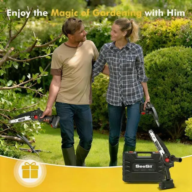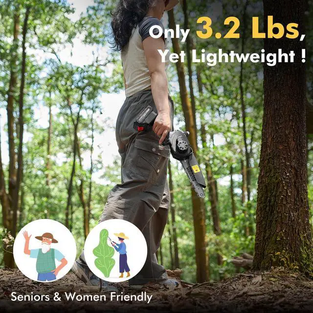 | Included Components | 1x Anti-Slip Gloves, 1x Goggle, 1x Chain Protective Sleeve, 1x Charger, 1x Screwdriver, 1x Empty Oil Bottle, 1x Cleaning Brush, 1x Sharpener, 1x Detailed Manual Instruction, 1x 8 inch Mini Chainsaw Cordless(DL07), 2x 2000mAh Battery, 2x Chain(One has been installed), 1x Extra Auxiliary Handle |