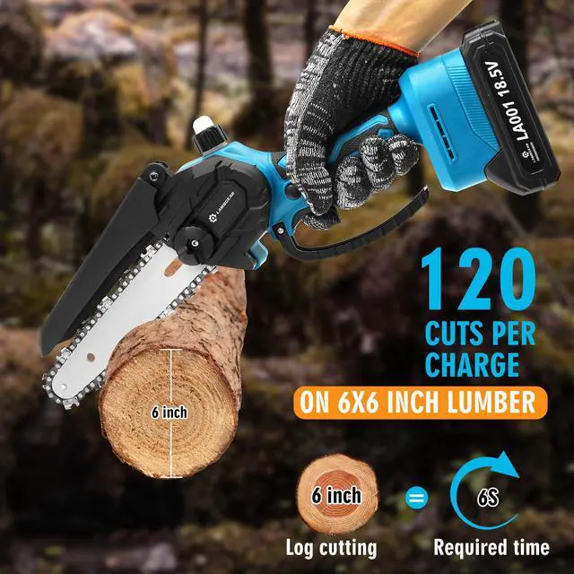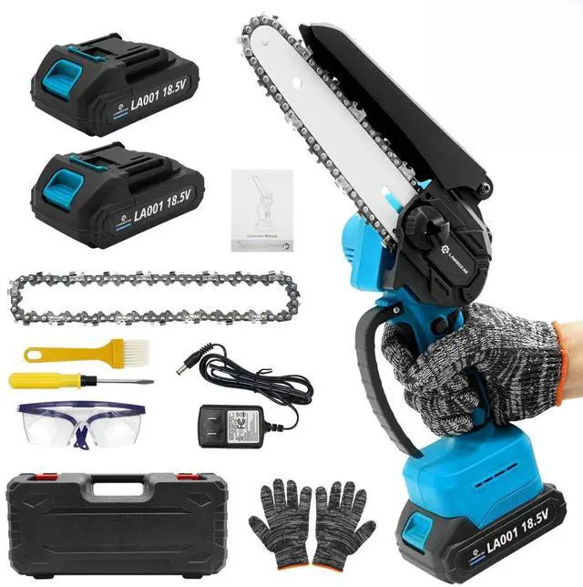 Rechargeable Large Capacity & Long Life Battery PackMini Cordless Chainsaw 6 Inch Featuring an electric chainsaw equipped with 2×21V 2000mAh rechargeable batteries, providing approximately 30 minutes of operation with the option to recharge at any time. This cordless handheld chainsaw offers convenience and speed, freeing you from the hassle of cords and making your garden artistry effortless.