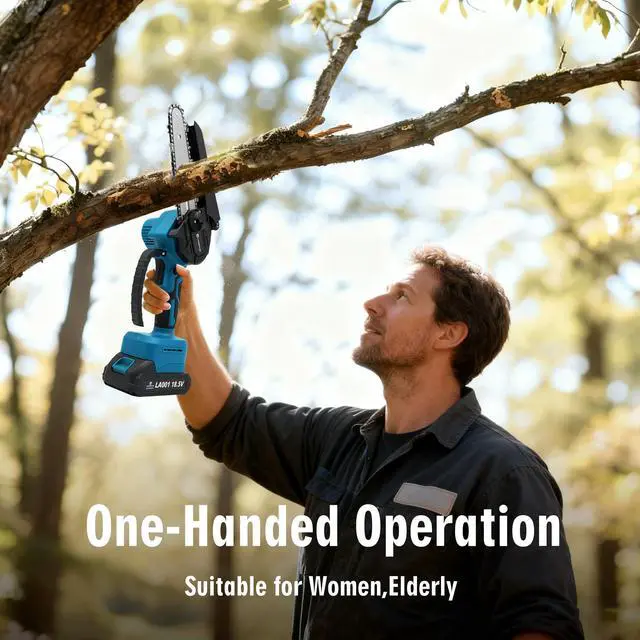 Portable and female-friendly small chainsawThe cordless mini chainsaw features a slim, lightweight design that can be easily operated with one hand, making it ideal for women, older users and beginners. Its ergonomic construction reduces fatigue, even during extended tasks.
