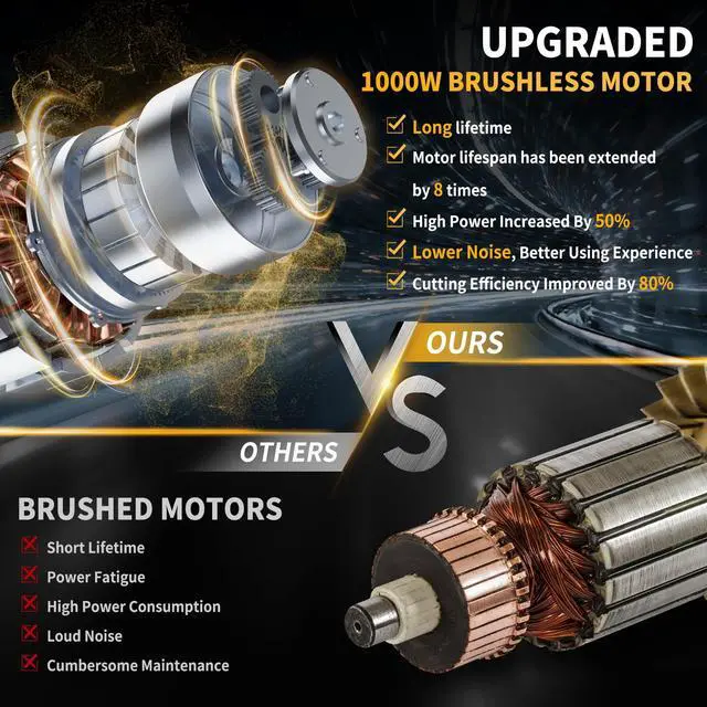 The high-performance brushless motor - JEXUGK wireless saw is equipped with a powerful 1000W brushless motor,offering outstanding cutting performance. It can easily cut an 8-inch branch within just 10 seconds (the cutting time may vary depending on the wood density). The upgraded cooling holes enable the motor to continuously output at high power,maintaining the optimal motor temperature and extending its service life