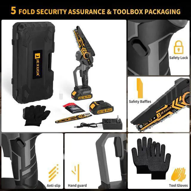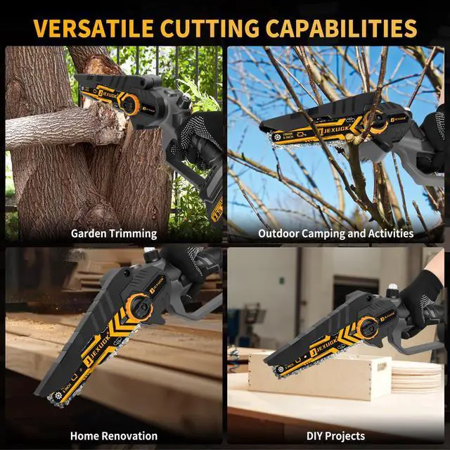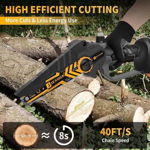 Multi-functional chainsaw - JEXUGK's battery powered chainsaw comes with 6-inch chains and guide plates,allowing you to switch sizes between different tasks - whether you are pruning branches,cutting wood or tending towards your garden shrubs,it can easily handle 99% of your cutting needs. Meet your various needs ranging from pruning delicate branches to chopping firewood