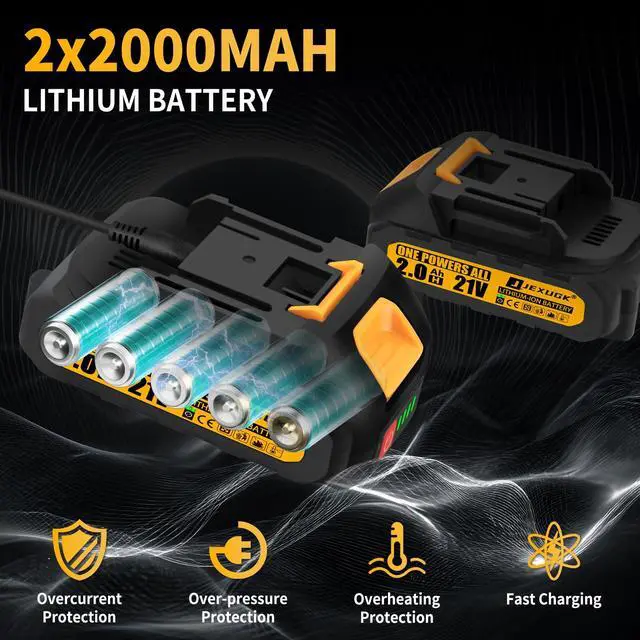 2x2.0Ah long-lasting battery and fast charger - JEXUGK electric chainsaw is equipped with two high-capacity 2.0Ah lithium-ion batteries,keeping you away from the hassle of frequent battery replacements and the embarrassment of running out of power. The built-in battery level indicator enables you to monitor the battery power,ensuring that you won't be caught off guard during work. Say goodbye to the struggle with wires and make your garden art easier