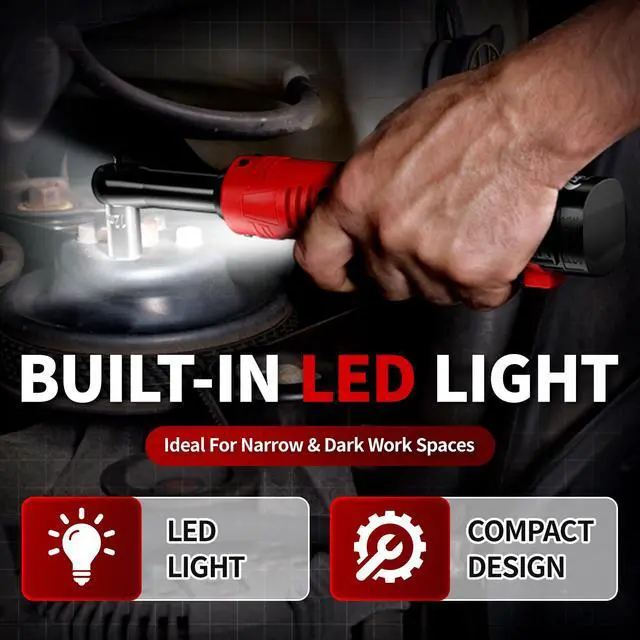 [Built-in LED & Power Indicator]: The cordless power ratchet wrench built-in LED light makes it easy to work in dimly lit confined spaces. A power indicator next to the switch will let you know how much power it have left, remind you to charge in time to avoid downtime during work