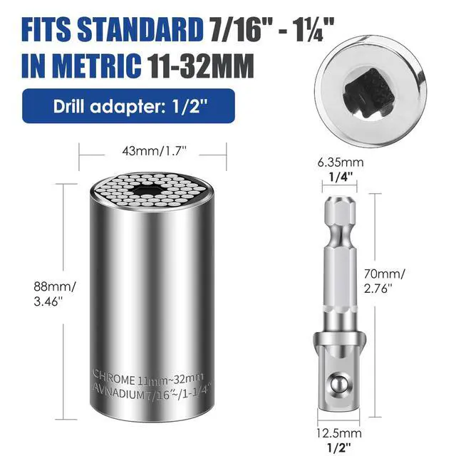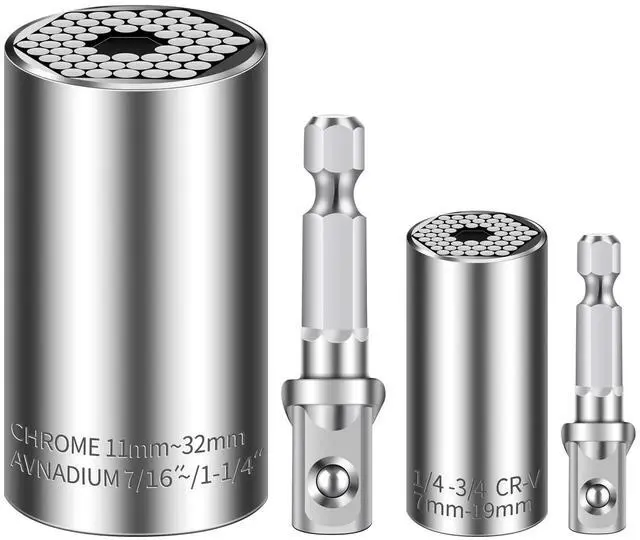 A self-adjusting socket wrench features 54 durable pins which made of steel. Allowing the socket to automatically conform to any shape.