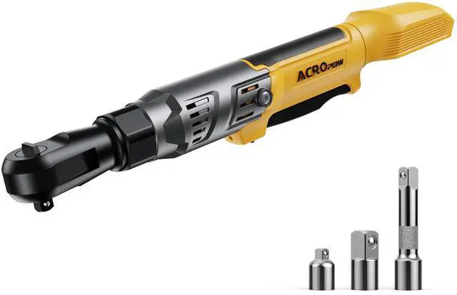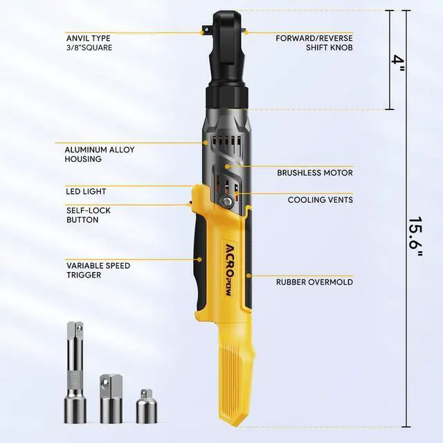 The package includes: ?1 x ACROPOW 3/8" cordless ratchet wrench, 1 x 3/8" to 1/2"adapter, 1 x 3/8" to 1/4" adapter, 1 x 3" extension bar, and 1 x User Manual.