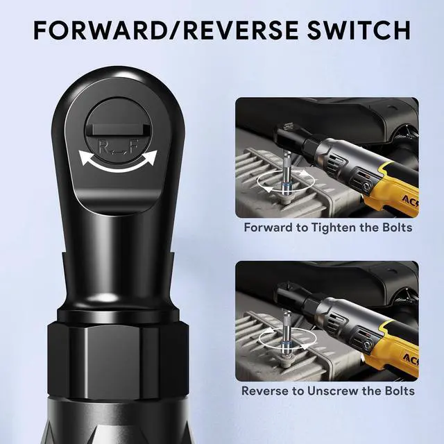 The Forward/Reserve switch can change the cordless ratchet wrench’s rotating direction and meet both tightening or loosing the bolts.