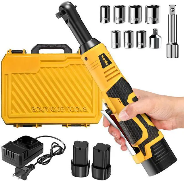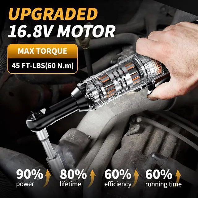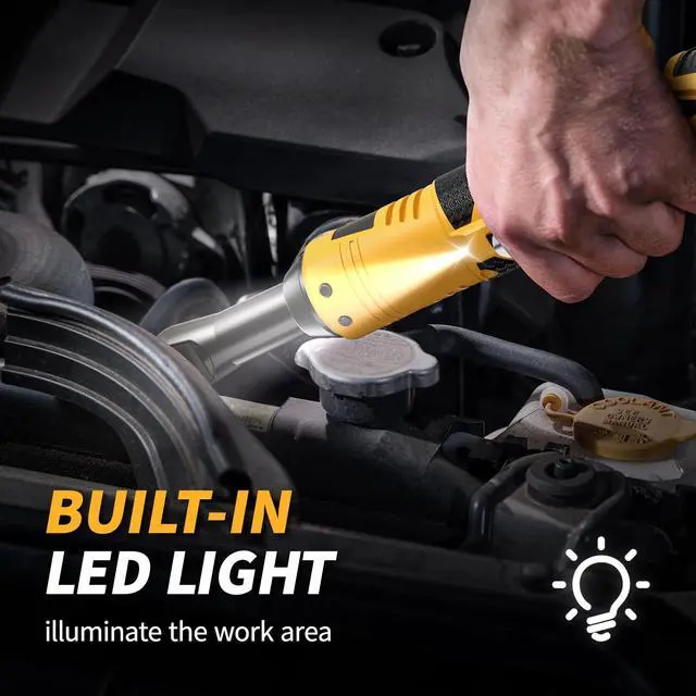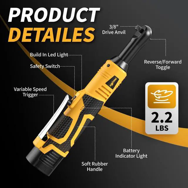 [Ergonomic Design]: Weighing only 2.2 lbs (including battery), this 3/8 electric ratchet features an ultra-slim and extended head design for effortless access to narrow spaces. The battery ratchet is built with a non-slip rubber grip that absorbs vibration during operation, minimizing hand fatigue and maximizing comfor