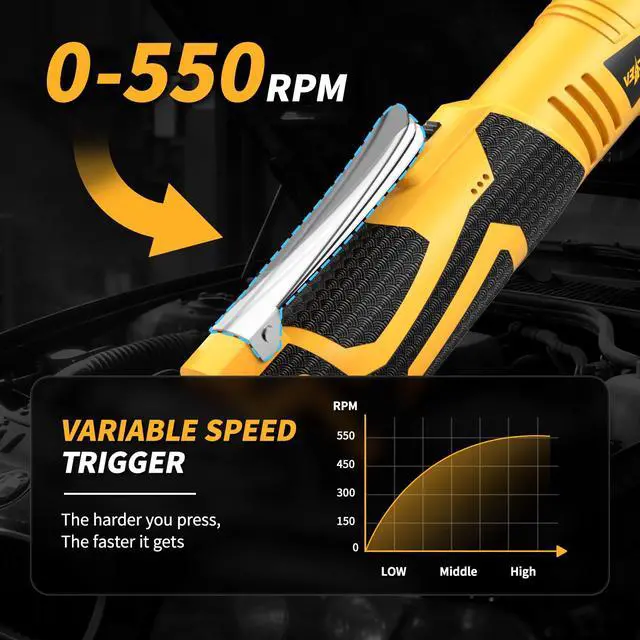 [Powerful Motor]: Electric wrench provides 16.8V pure copper motors, with a max torque of 45 ft-lbs and 550 rpm maximum variable speed. Its speed can be adjusted according to different task needs, help you to tighten or remove nuts easily, making it perfect for any auto maintenance, construction or home repair work