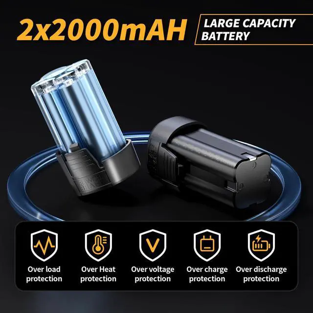 [High-Performance Battery]: The power ratchet comes with 2 x 2.0Ah rechargeable batteries. Its estimated that the life expectancy of each battery is at least a thousand times cycles, stop worrying about battery life. Moreover, bidirectional heat output channel can accelerate heat dissipation and effectively stabilize the working temperature