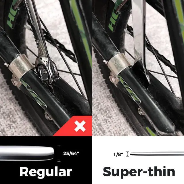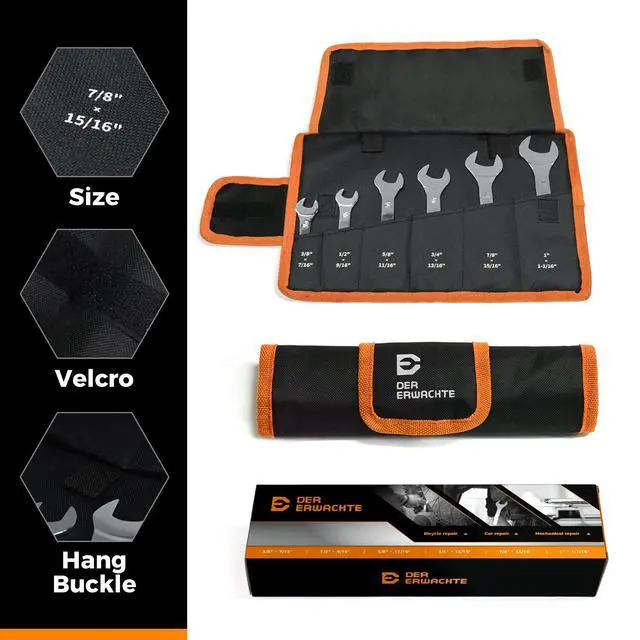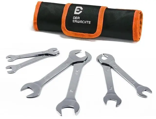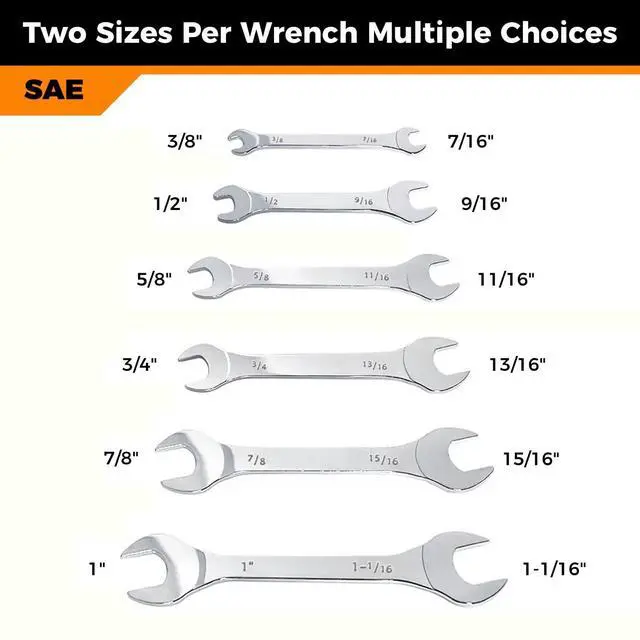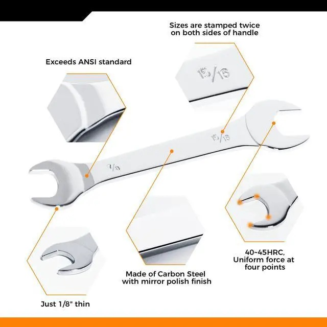 1/18' SUPER THIN wrenches which let you reach fasteners in tight clearance. Useful especially in narrow spots where traditional wrenches cant reach. Practical design, widely applicable in industries as bicycle, motorcycle, car repair repairing and maintaining, household, machinery and electric power. Made of premium carbon steel with mirror polish finish. Wrench sizes are stamped twice on both sides of handle for easier size identification: 3/8"x7/16", 1/2"x9/16", 5/8"x11/16", 3/4"x13/16", 7/8" x 15/16", 1" x 1-1/16".