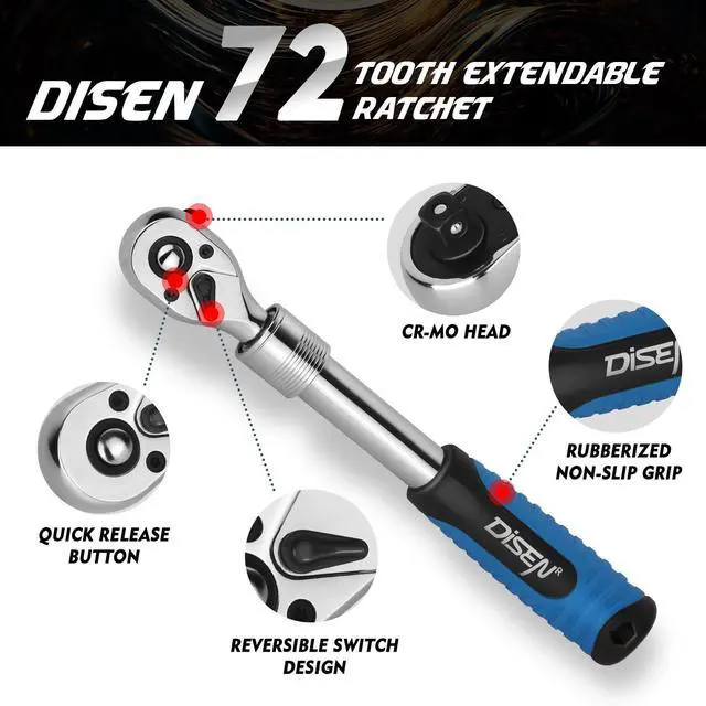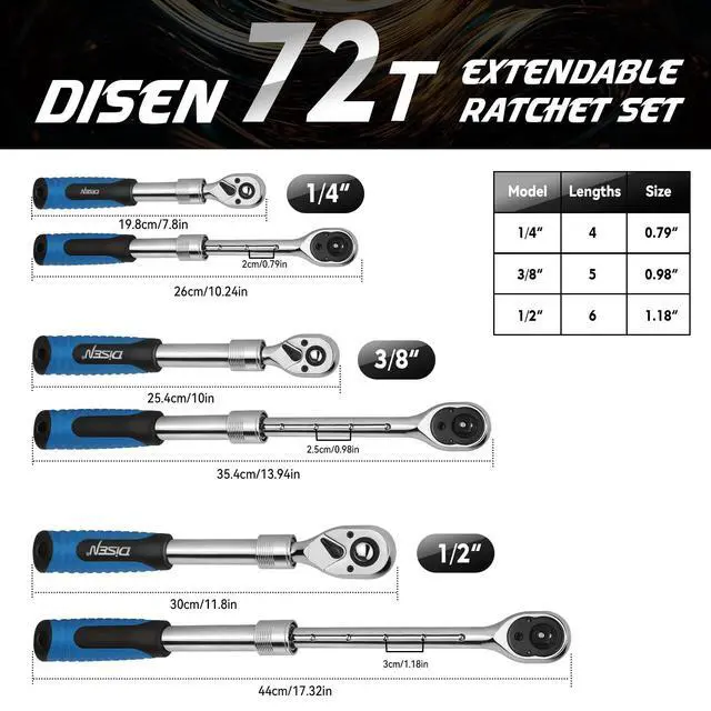 Unlock every project with precision. The DISEN 3-PC Extendable Ratchet Set, featuring 72-Tooth mechanism, reversible switch, and soft-grip extendable handles, delivers professional torque and access for automotive, home, and shop repairs.