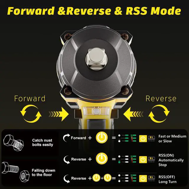 - Reverse Auto-Stop Mode ensures safety and comfort by preventing the loss or drop-down for nuts or bolts.